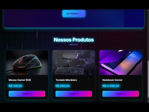 Design premium com cores neon (azul, roxo, rosa), animações avançadas e fundo interativo.